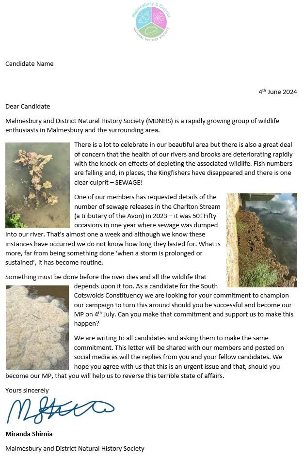 Letters have been sent to all the candidates to become the new MP for the South Cotswolds constituency asking for them to commit to supporting our campaign to clear up our rivers and brooks should they be elected on 4th July. The sewage spills must stop and we want their support to do this.